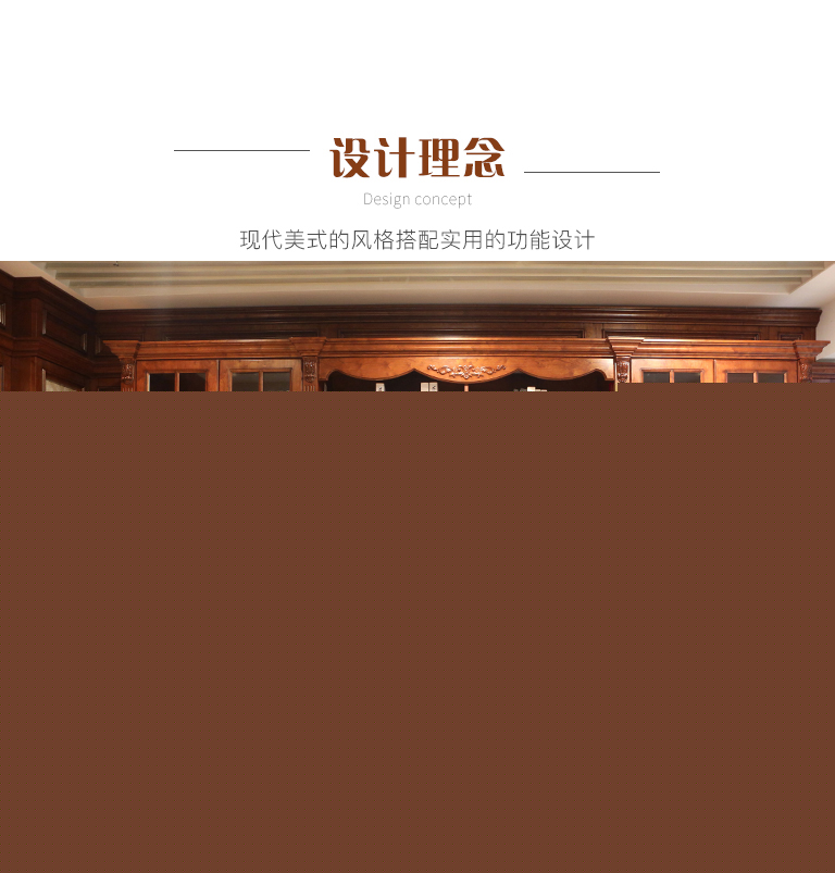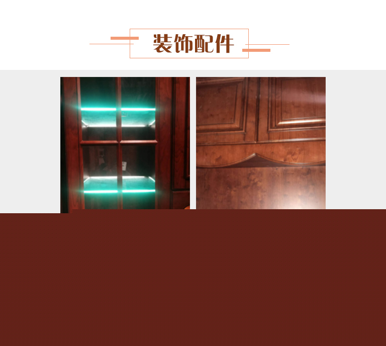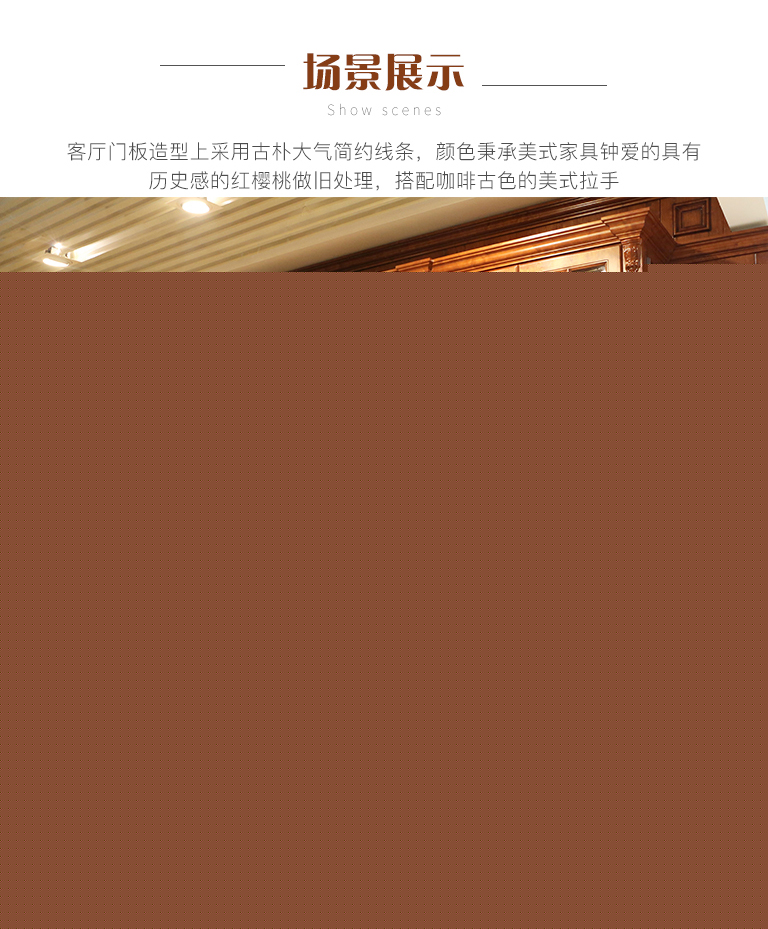 | 細節描述 | 客廳門板造型上采用古樸大氣簡約線條,顏色秉承美式家具鐘愛的具有歷史感的紅櫻桃做舊處理,搭配咖啡古色的美式拉手。注重黃金比例設計,巧妙的柜體結構形成對稱,強調家具帶給人的平和感,并且把現代的功能納入其中,裝飾效果好,穩定性強,儲物更加方便。 |
