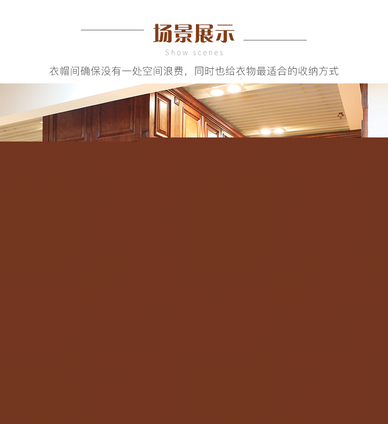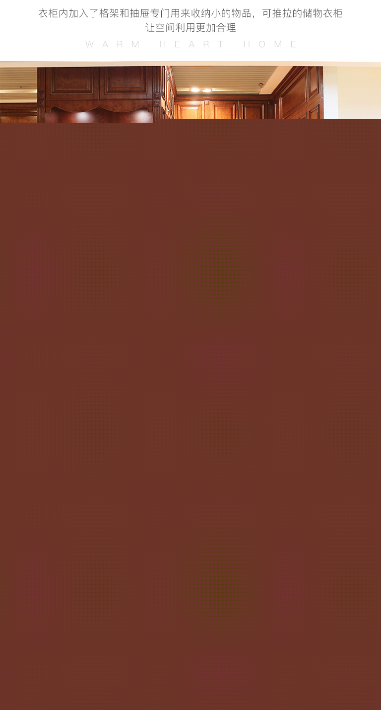 | 細節描述 | 衣帽間確保沒有一處空間浪費,同時也給衣物最適合的收納方式。衣柜內加入了格架和抽屜專門用來收納小的物品,可推拉的儲物衣柜讓空間利用更加合理,軟包護墻板和鏡子,舒適美觀,使用安全 ,使整體空間裝飾效果明顯,方便保養維護。漫步其中,每一寸空間都擁有無論倫比的精致與奢華。 |